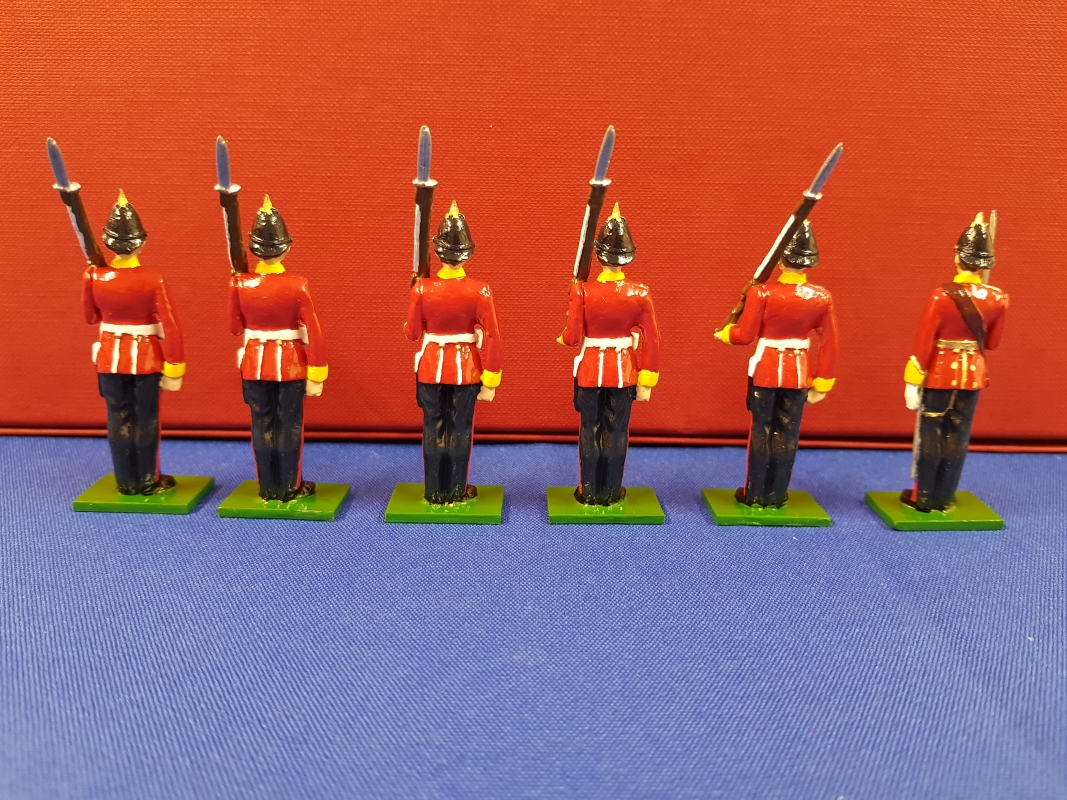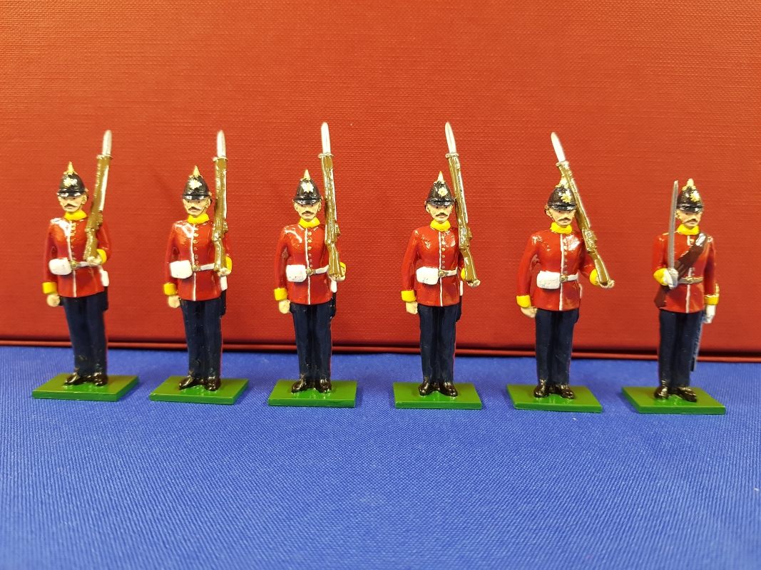 Officer and five soldiers in full dress at attention slope arms.