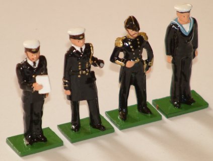 Admiral in full dress, Flag Officer in frock coat with telescope under arm, Petty Officer with 'Orders of the day' and Able Seaman at attention.