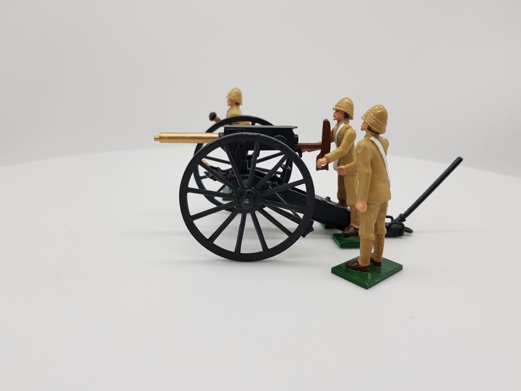 1 Pdr Maxim machine gun commonly referred to as a Pom Pom or Ten a Penny gun with a two man British Royal Artillery Gun Detachment in full service order and an Officer with binoculars.