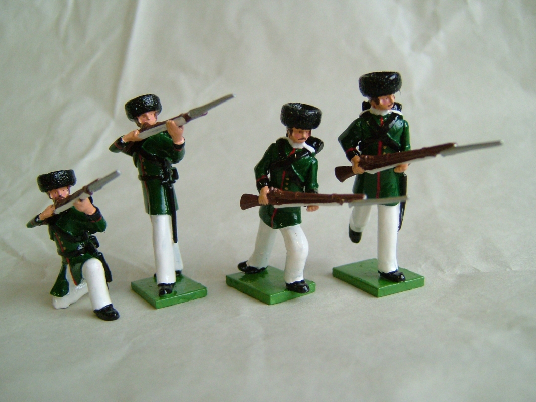 One Infantryman loading rifle, one Infantryman kneeling firing, one Infantryman standing firing and one Infantryman at the read...